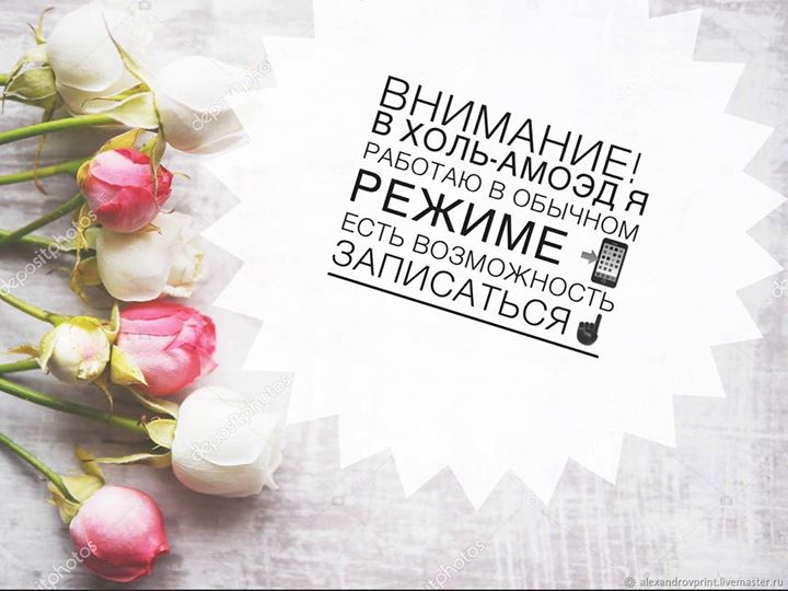 Девочки, многие из вас спрашивают работаю ли я на следующей праздничной неделе...и ответ - ДА! 🤗 Все дни חול המועד я буду принимать в своём обычном режиме, то есть с 10:00-19:00 (в семь беру последнюю клиентку).